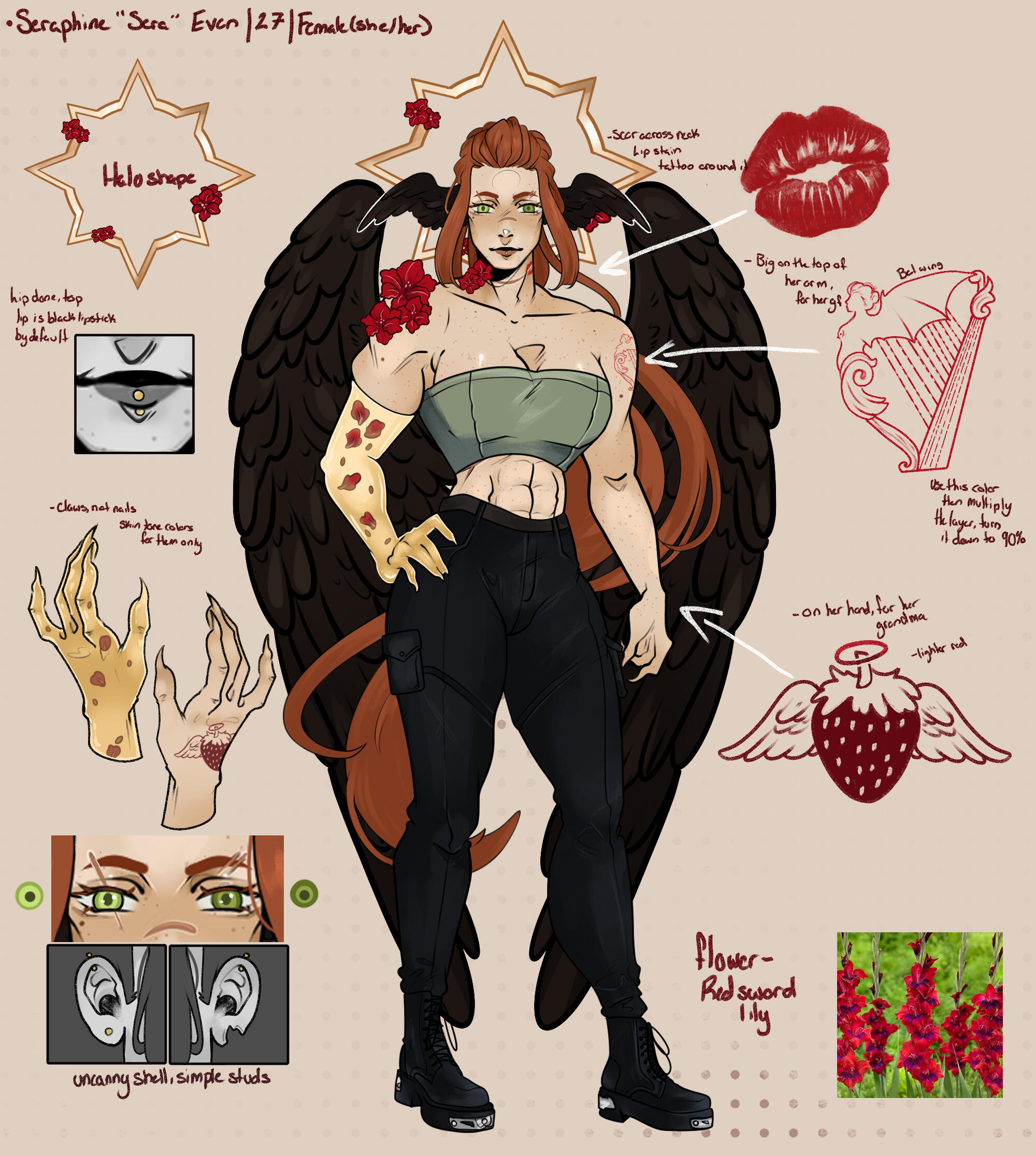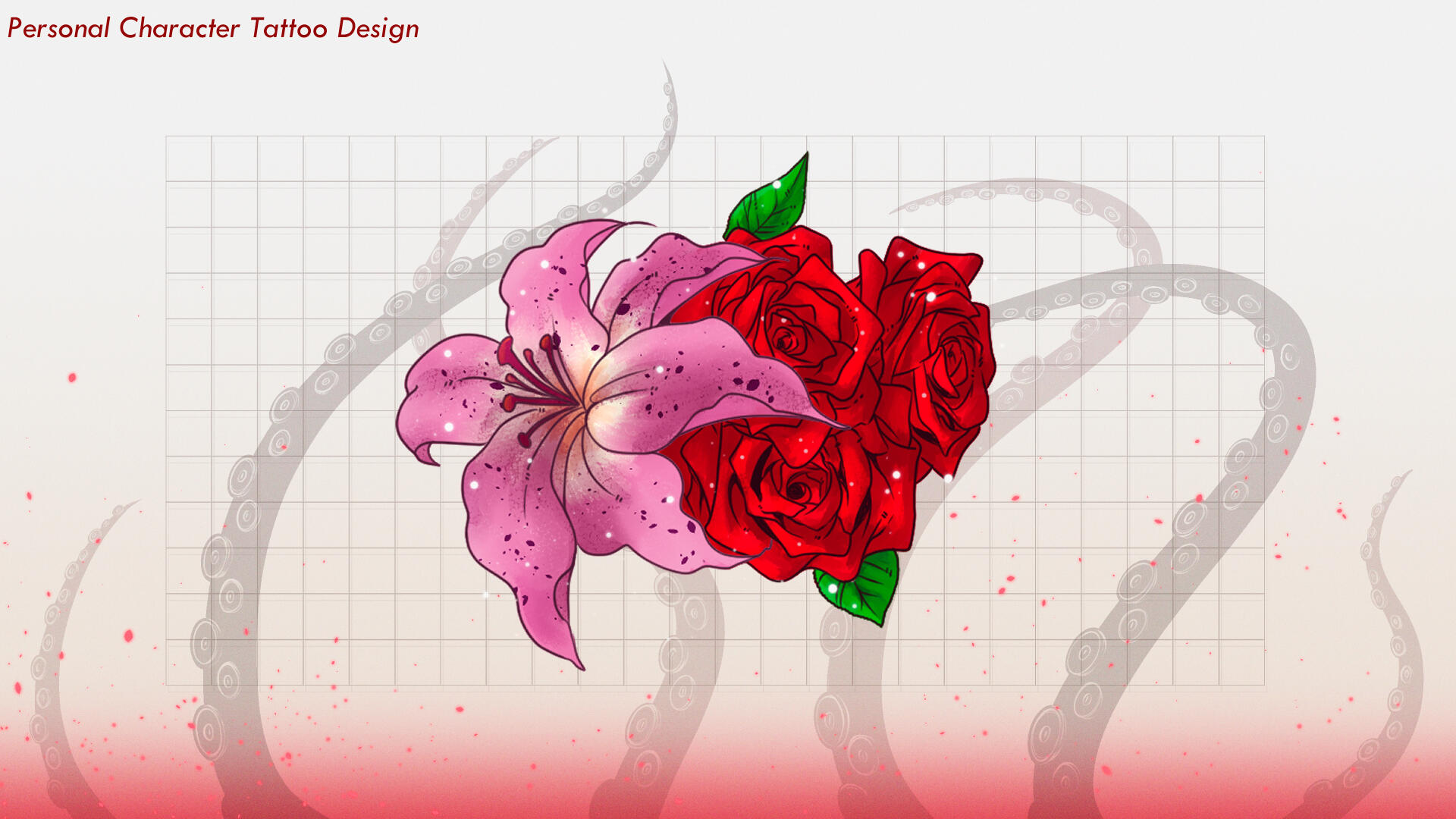 • Tattoos can have their own canvas, they will be done on 1000x1000 canvas. I will not do complex tattoos apart of references.• Color palletts, size scaling, and text are all free! They won't require any addtional payment. Stuff such as freckle placement, scar placement etc. are most likely going to be free as well AS LONG as it is simple. This needs to be discussed.• Small icons to add around of things your character likes can be added as long as their simple. If you want something more complicated, feel free to discuss this!