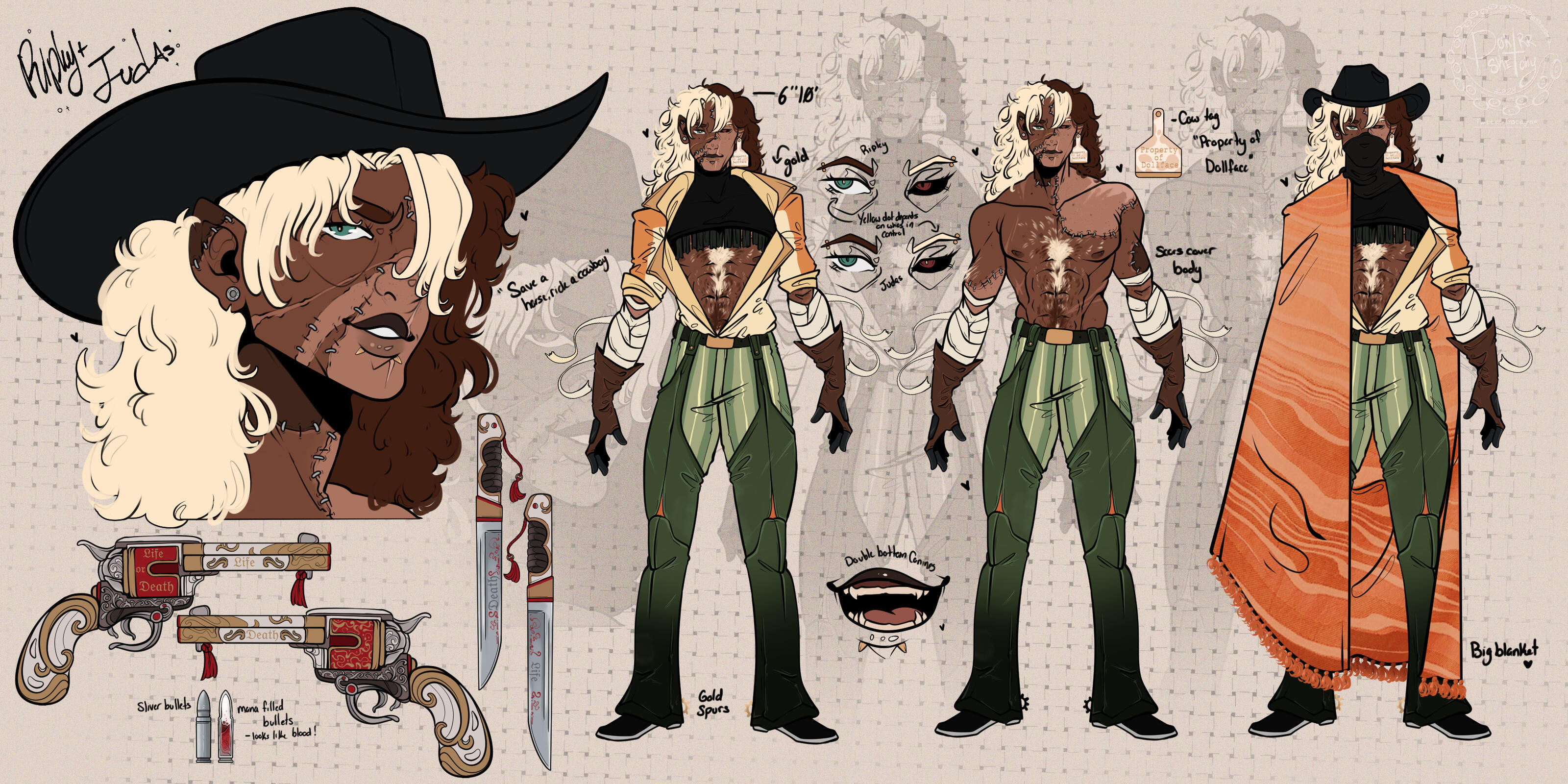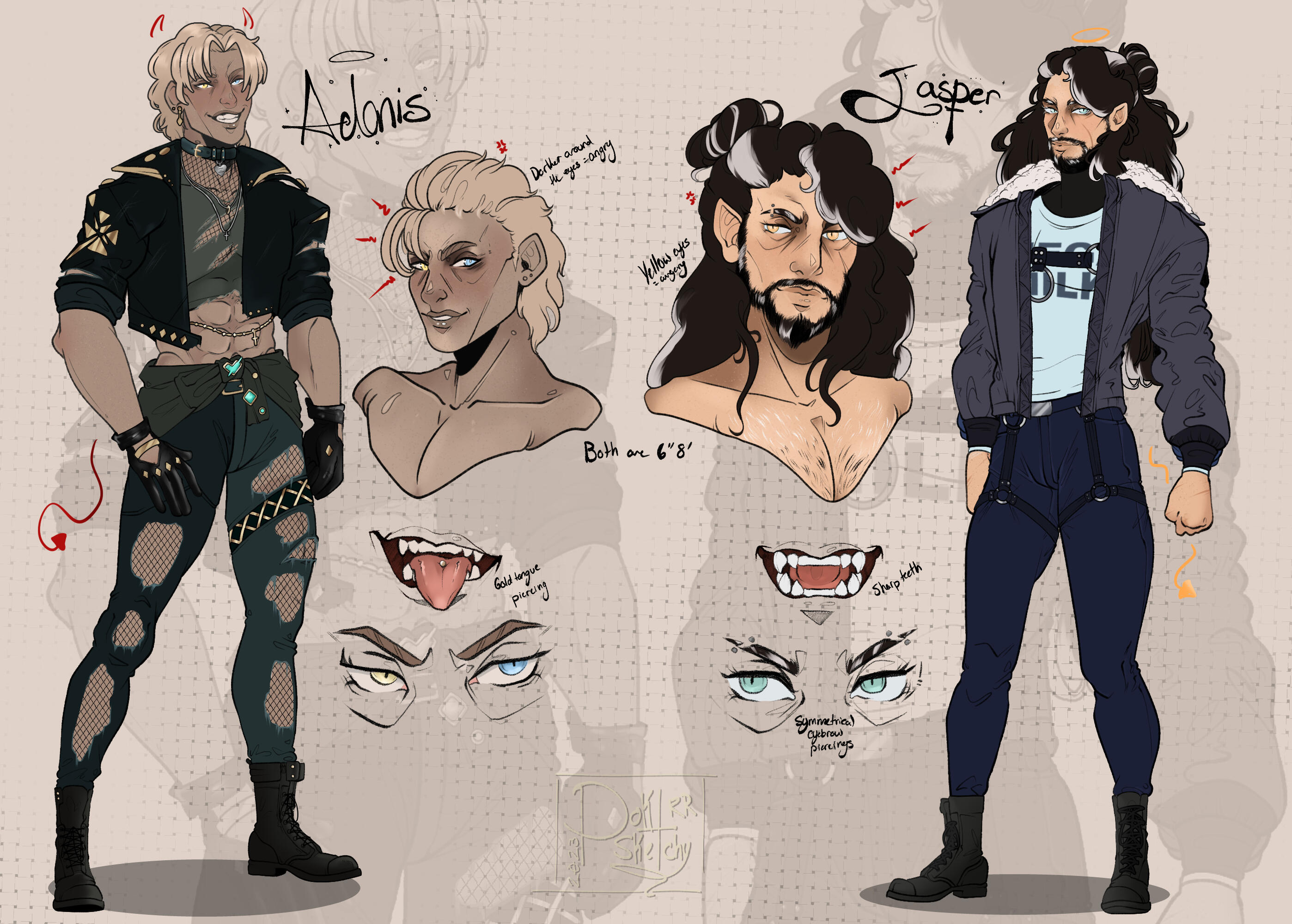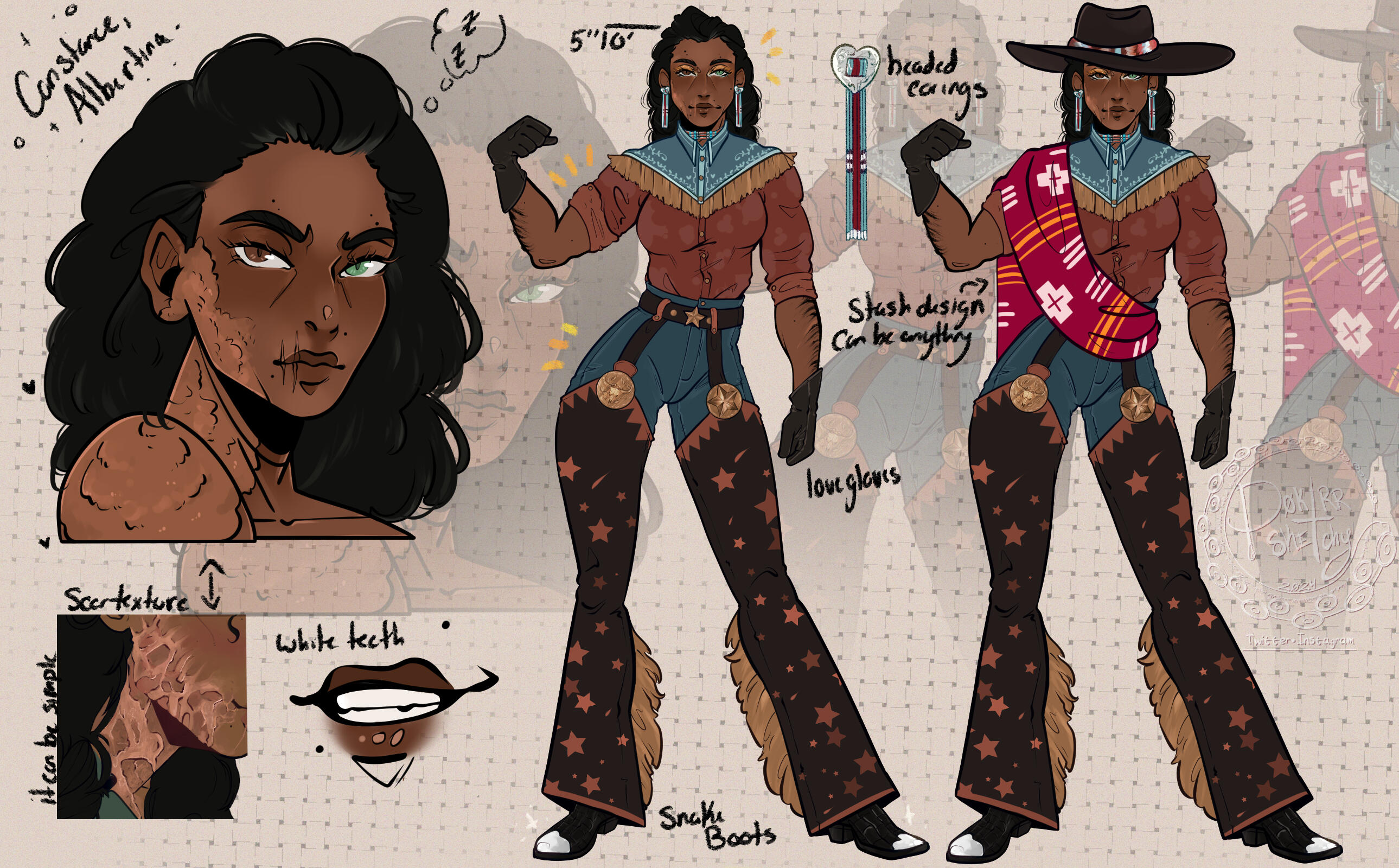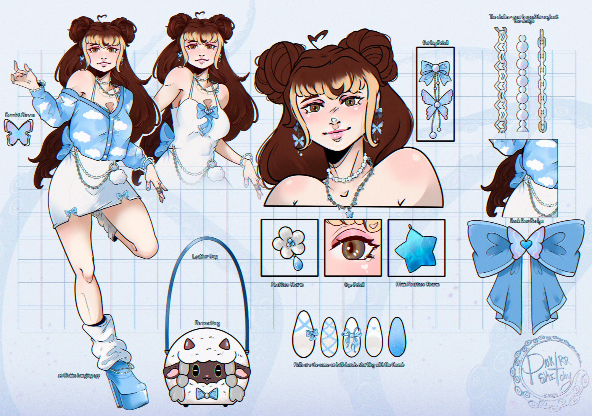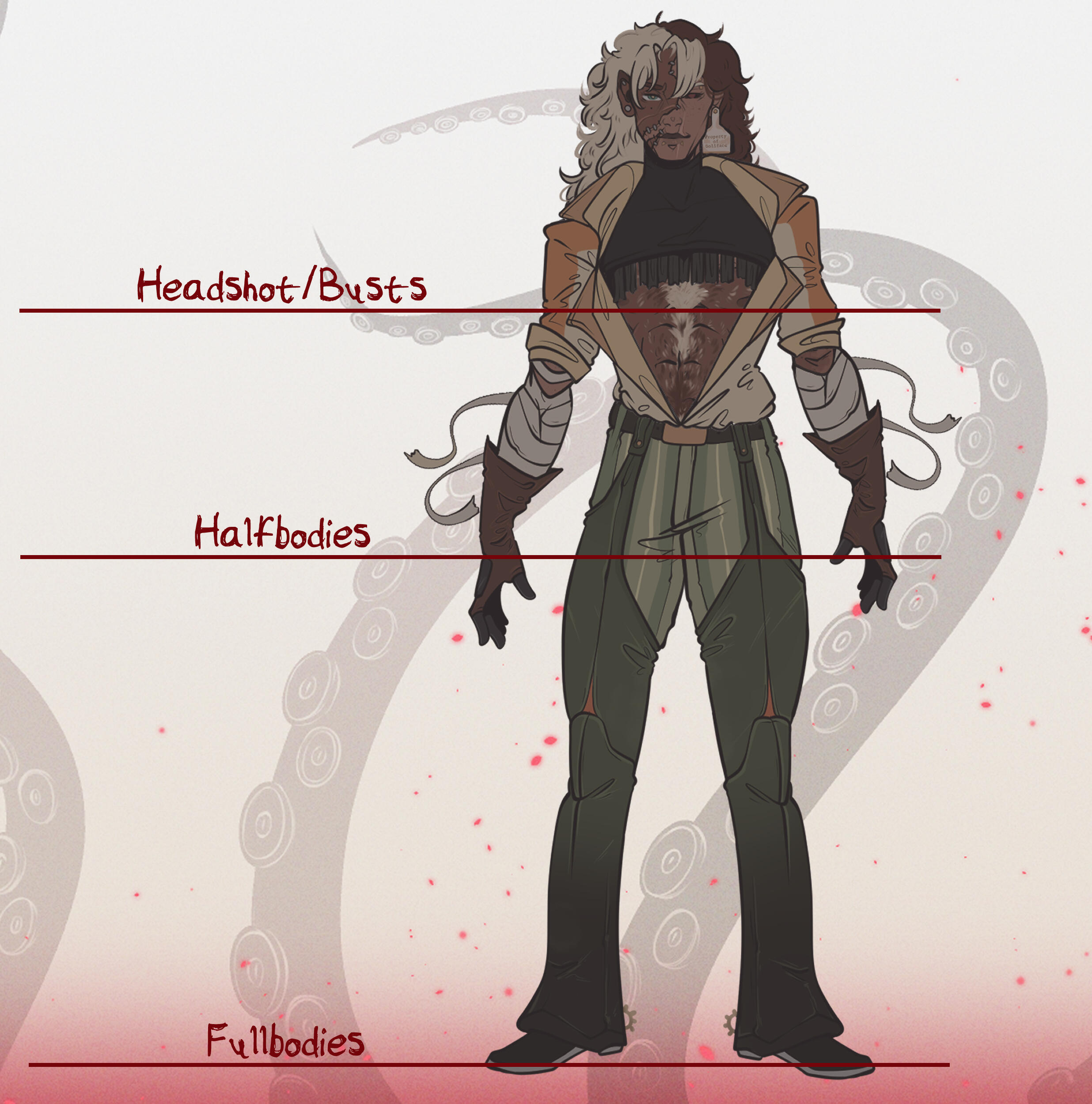 •What comes with a custom? By default a custom will come with one fullbody, a singular headshot, zoom ups on the eyes, mouth, ears (this will only be done if details need to be shown though) as well as any addtional details needing to be seen from the design and outfit.A backview can be done, but I only like doing those if need be!Some stuff may not be an addtional charge such as necklaces, rings, etc. if its simple enough. Stuff such as tattoos, weapons, props, addtional outfits though will always cost and addtional fee.Sometimes for textures or any pattern that I use, I will always try to ensure you have a seperate file that you can use for references or even a copy and paste. These typically are factored into the price.Nude bodies by default are "barbie" or "ken" doll style, meaning no genitals are drawn unless spoken about.